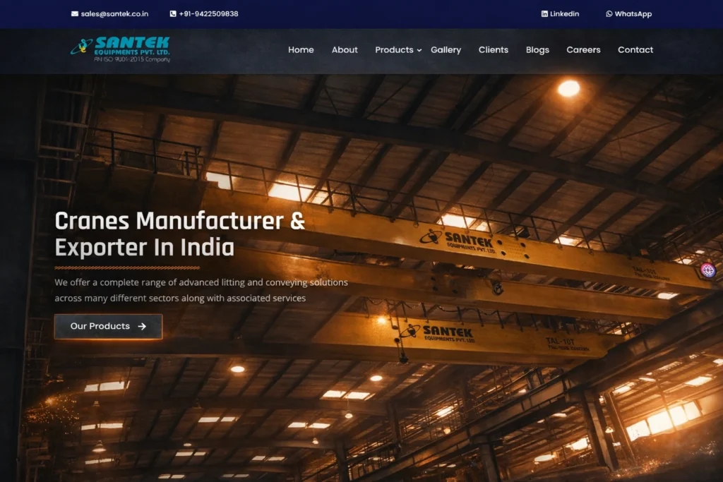 The Client Santek is a renowned manufacturer of cranes, based in Pune, India. With a diverse range of products, including EOT Cranes, Goliath Cranes, Grab Cranes, Gantry Cranes, and Monorail Cranes, they cater to clients across various industries worldwide.